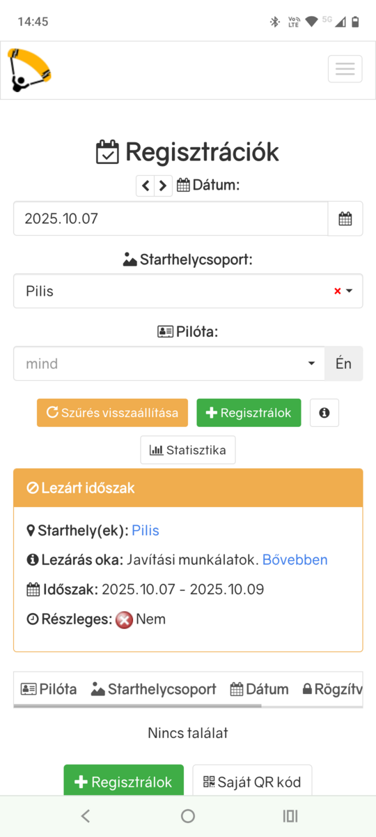 - megjelennek a Regisztrációk menüben, ha a starthely és a dátum szűrés aktív, és aznap van lezárás